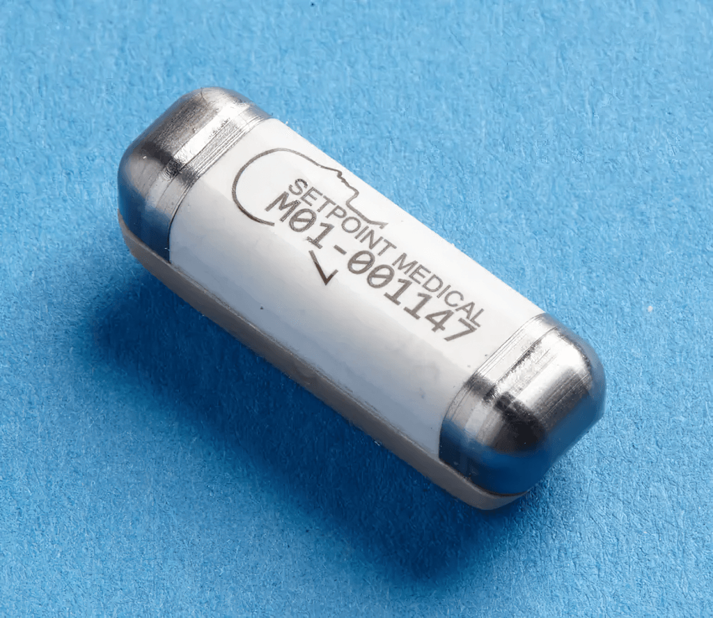 SetPoint Medical has pioneered a miniaturized electroceutical device that can be implanted in the patient’s neck. The device is designed to be implanted with minimal invasion and has an integrated electrode and wirelessly rechargeable battery. The silicone holding pod ensures the device remains stable and secure at the implant site, minimizing complications associated with device migration.