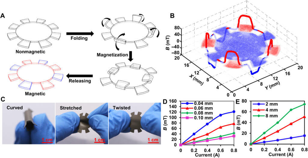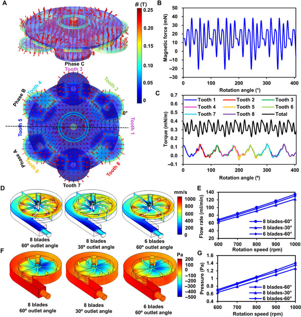 The magnetic rotor is made up of origami magnetic membranes, which exhibit enhanced magnetism and definable magnetic polarities. These membranes are integrated with a silicone impeller to generate fluid propulsion power. The flexible PCB circuit creates a pulse-width modulation (PWM) signal that regulates the six electromagnetic coils connected to form the stators in three phases.